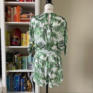 Linen tropical print beach romper with tie sleeves. Elastic waist. Shorts length approx. 15.5” UK 12 which is equivalent to a US 8, but fits more like a US 6.