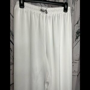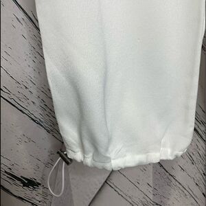 White silky polyester joggers with elastic/toggle waistband.