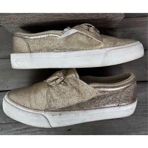 They are adorned with large, decorative bow details at the front, each secured with a metallic ring, adding a touch of elegance and flair. The shoes have a casual yet chic look, with a white sole that contrasts nicely with the gold upper, making them a versatile addition to various outfits.
