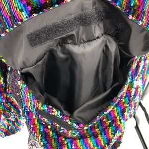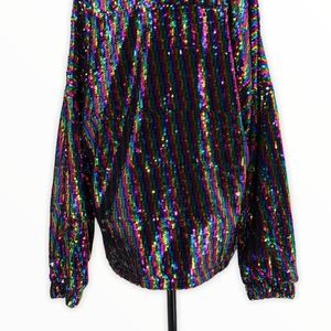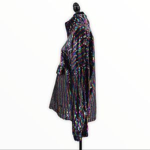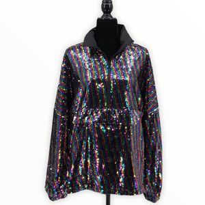 Stand out in this half zip collared pullover covered in multicolor striped sequins! Zips down to veIcro pouch at waist, perfect for festivals and events to hold your cards, phone etc. Lined, long sleeves. Sold as Men’s but could be worn by anyone!