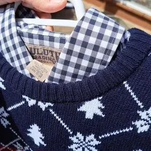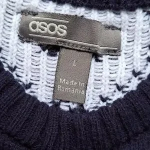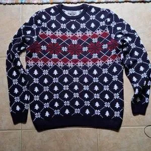 Sweater is new.Navy and white with dark red in front.🚩Yes NEW🚩.Made in Romania.Duluth shirt(large) underneath for sale in closet..This listing is for sweater only.Mens large.Inspection sticker still on material tag.