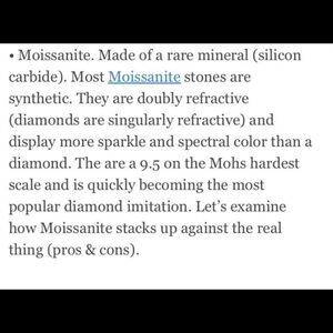 ASQ Beautiful 18” 1ct Moissanite Diamond necklace set in Sterling 925 Silver. We work hard to find high quality fine jewelry for our buyers. Moissanite. Made of a rare mineral (silicon carbide). Most Moissanite stones are synthetic. They are doubly refractive (diamonds are singularly refractive) and display more sparkle and spectral color than a diamond. The are a 9.5 on the Mohs hardest scale. An ideal cut one carat D flawless Moissanite costs a fraction of natural diamond with the same grade. Example, you could pay $5K-10K for a natural diamond with specs I just mentioned, but a Moissanite would be under $1K..