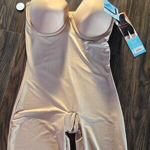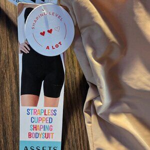 Fabulous shaping bodysuit from ASSETS by SPANX. New with tags (retails for $48) and in new/excellent quality and condition. 360-degree shaping. Built-in bra with five-ways to convert to wear. Convertible, adjustable straps plus the opportunity to go strapless. Awesome shapewear for your wardrobe. SIZE X./FITS A 38 C OR D. Length from bra to shapewear "shorts" = 23."