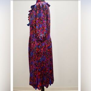 Elegant floral dress featuring a vibrant red and blue pattern. Perfect for any occasion with its flattering V-neck and comfortable fit.