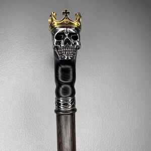 * Ergonomic L-shaped wood handle with cast metal skull king with gold-tone crown