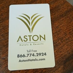 The card displays the Aston Hotels & Resorts logo, the text "ASTON Hotels & Resorts," the toll-free number 866.774.2924, and the website address AstonHotels.com.