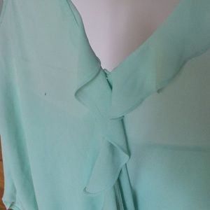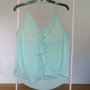 ASTR halter from Nordstrom with a faux wrap front and ruffles down the front. Halter neck is adjustable. Size large. There's a button in the front of you want to make the neck lower. Great color!