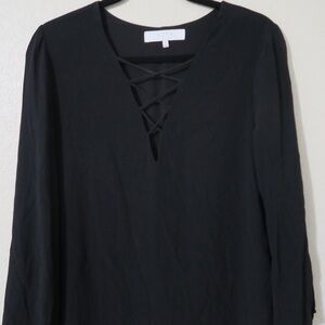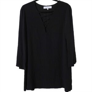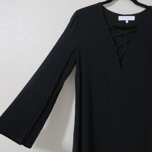 Criss cross v-neckline shift mini long sleeve black dress by ASTR the label, wide sleeves, rayon, lined, super lightweight. Great preloved condition.
