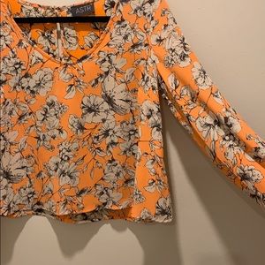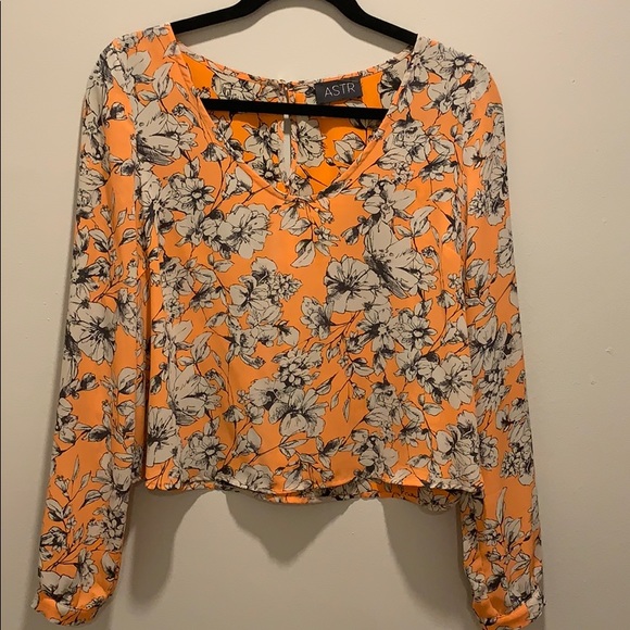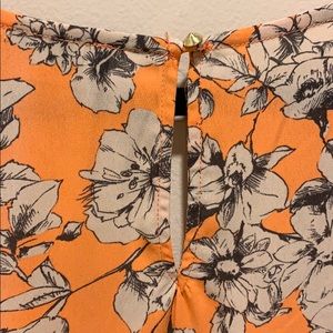 Floral blouse. Bright peach color which is a fun take on a traditional floral print. Flowy with gold bead details on cuff and back cutout detail. Perfect condition! Medium true to size. Not quite a crop, but it is meant for a shorter fit.