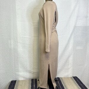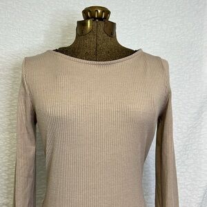 ASTR The Label creamy tan colored cross cross back fitted ribbed midi dress size Large Gently pre owned condition