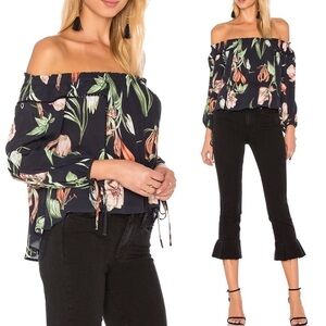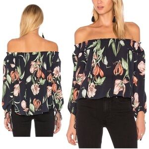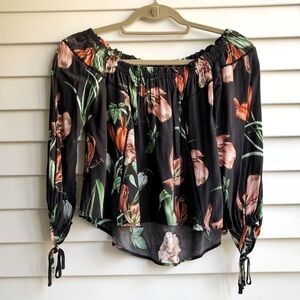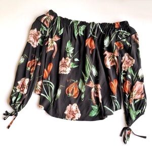 ASTR Chavelle Off the Shoulder Top in black. Openwork detailing furthers the airy aesthetic of a swingy shoulder-baring top covered in fresh blossom floral print. Off-the-shoulder neck. Bracelet length sleeves with tie detail. 100% viscose. Worn once and in excellent like new condition with no visible signs of wear. Approx. 14.5” long in front, 16.5” long in back and 17” across from armpit to armpit.