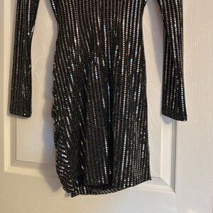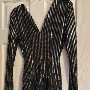 Make a statement in this eye-catching black mini dress with dazzling silver sequin stripes. Featuring a plunging V-neckline and ruched detail at the waist, this dress is designed to flatter your figure while adding a touch of glamour. Perfect for parties, special occasions, or a night out. Size small, gently used, and in excellent condition. Pair it with heels for a show-stopping look!