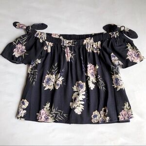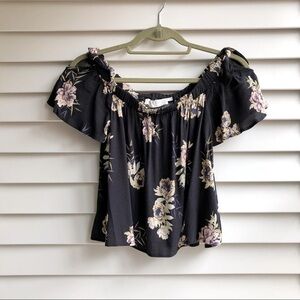 ASTR Off The Shoulder Cropped Floral Top in Black (almost looks navy blue) with multi color floral pattern. Floral-print crop top with off-the-shoulder neckline. Flutter sleeves with tie detail. Draped silhouette. Cropped hem. Pullover style. Viscose. Worn once and in excellent condition with no visible signs of wear. Approx. 14” long and 16” across from armpit to armpit.