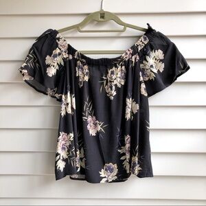 ASTR Off The Shoulder Cropped Floral Top in Black (almost looks navy blue) with multi color floral pattern. Floral-print crop top with off-the-shoulder neckline. Flutter sleeves with tie detail. Draped silhouette. Cropped hem. Pullover style. Viscose. Worn once and in excellent condition with no visible signs of wear. Approx. 14” long and 16” across from armpit to armpit.