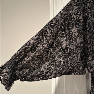 Gorgeous dress. Sheer w/ and under slip dress. Flirty feminine with a full bell sleeve. Black paisley soft velour velvety design on a sheer background. Great with boot, sandals etc. Hits above knee. Bundle to save $$$