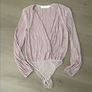 Chic dusty pink bodysuit with pleated texture. Features a wrap front and long sleeves.