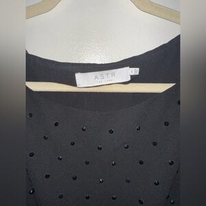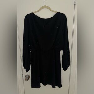Sophisticated black dress with long sleeves. Ideal for evening occasions. Crystals placed sparingly all over.