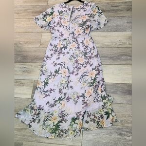 ASTR Floral Maxi Dress with Ruffle Details Size Medium. Elegant floral maxi dress with ruffle details. Features a beautiful mix of colors including purple, green, and cream. I'm a highly rated fast shipper.