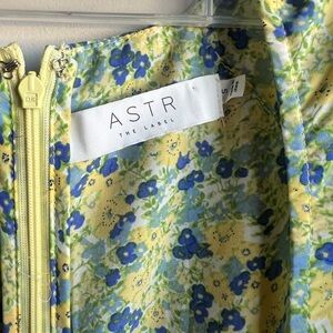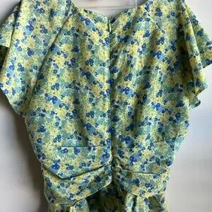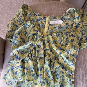 Charming floral top with ruffle details. Features a vibrant blue and yellow pattern.
