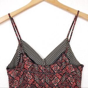 ASTR maxi dress. Geometric fabric with stripe accents. V neck, full button down closure on front. Adjustable straps, no stretch. Not great for a large bust!