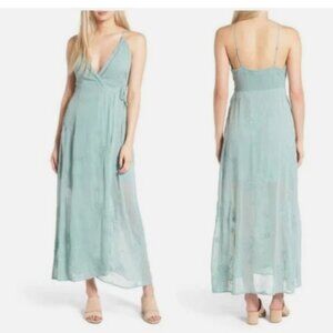 This elegant dress by Astr is perfect for a wedding guest or cocktail event. True wrap w/tie, it offers a flattering silhouette w/its sleeveless style, spaghetti straps, v-neckline and is lined. Its a standout choice for any special occasion. The fabric is lightly textured with scattered embroidered floral details that add depth and softness.