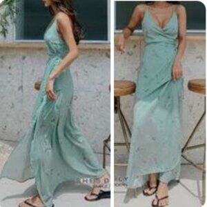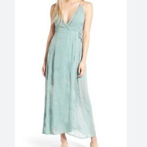 ASTR Green Wrap Tie Front Dress with Embroidered Floral Detail – Size Large