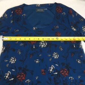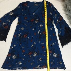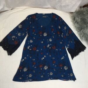 Blue dress with black lace trim at cuffs - all over floral pattern- fully Lined - size XS - gently worn, no flaws - last 2 photos are for style, this dress is blue