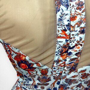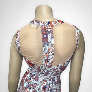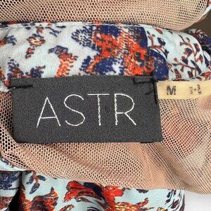 ASTR floral summer dress with nude sheer panels on back and shoulders. Center back zip. Fitted at waist. A line. Fully lined. Some stretch.