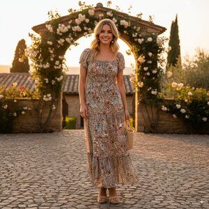 The beauty of an English garden in a dress by Astr. A flowy maxi dress with a soft and airy feel is just what every fashionista needs during the summer social season. There is a hidden back zipper and elasticized neckline allowing you to wear the cap sleeves on or off shoulder. A front tie finishes with a subtle keyhole. The a-line style enhanced by a sheer overlay is backed by a solid lining, giving a slightly layered look. Gentle shaping will complement your every move. The ruffle at the hem completes the refreshing look that's too cool for a hot summer.