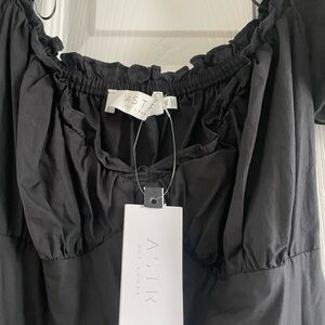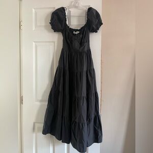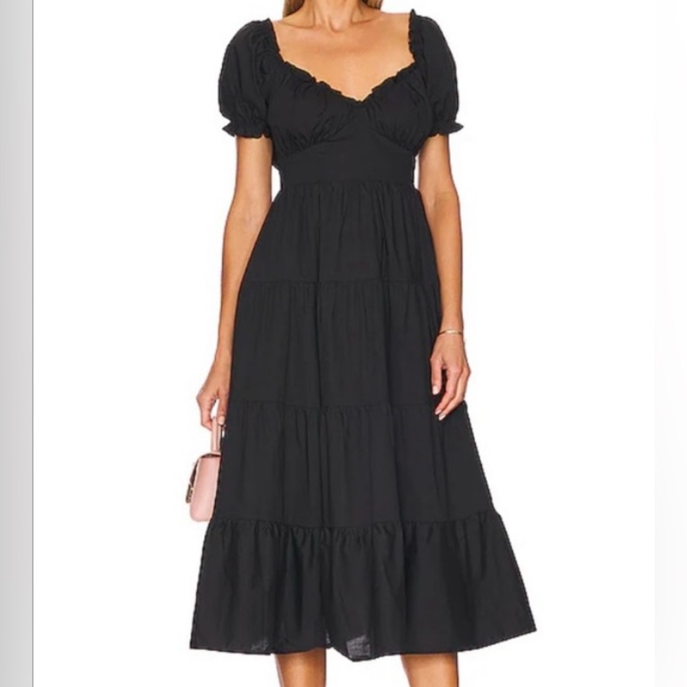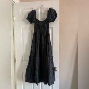 Chic black dress with ruched detailing and tiered skirt and puff sleeves!