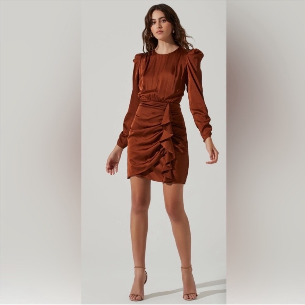 Elegant backless dress by Astr. Features a rich rust color. Long sleeves with ruffle details. Perfect for evening wear.