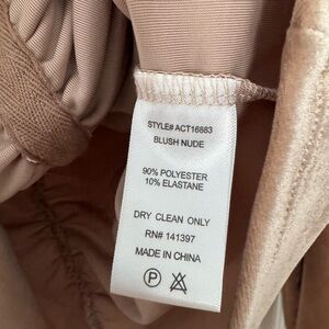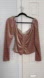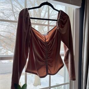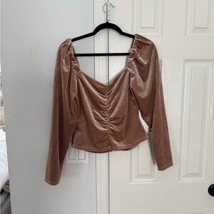 New without tags, never worn. Chic velvet top with ruched front. Long sleeves and flattering fit. Perfect for stylish outings. Color is a beautiful blush / nude.