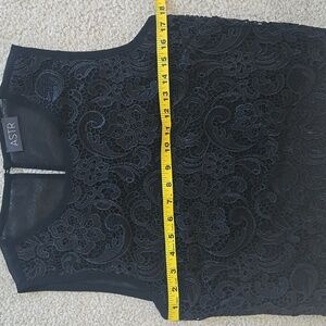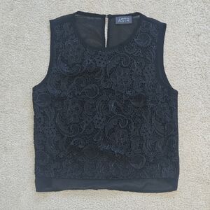 ASTR sheer black lace crop top. Size medium. This tank top is made of 100% polyester chiffon. Keyhole on the back of the neck and a cut out on the back of the waist. Easy to dress up or down. So cute for a night out or date night.