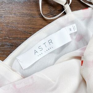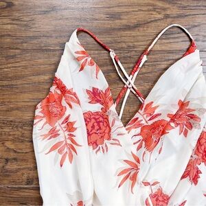 Gorgeous camisole tank top by ASTR The Label. “Strappy Floral Cami” style in "RED-TAUPE FLORAL" (orange-red flowers on a cream/ecru background). Draped cross-over front with criss-cross back spaghetti straps. Elastic waist with peplum. Bust approx 36“, waist 24-34”, length approx 20“ (adjustable w straps). Size M, excellent preowned condition.