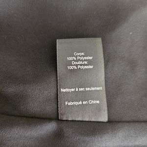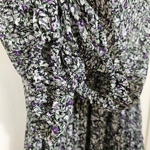 -Dress is lined inside, features a floral print throughout consisting of green, purple, gray and white colors on a black background