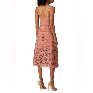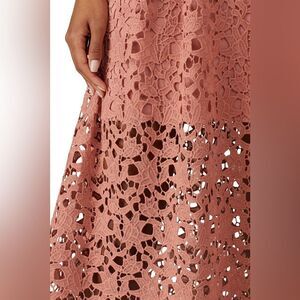 The stunning midi dress is fully lined with zipper at back. Adjustable straps and lace overlay. Amazing quality! A perfect corally- pink color.