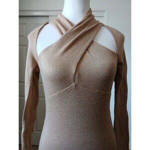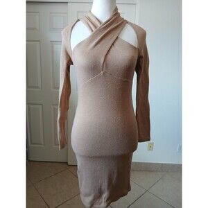 The ASTR THE LABEL Wrap Neck Cutout Long Sleeve Brown Knit Dress in size Small is a stylish and versatile piece suitable for various occasions such as travel, parties, or cocktail events. Made of polyester knit fabric, this bodycon dress features a halter neckline and long fitted sleeves, perfect for the fall, winter, and spring seasons. The dress has a pull-on closure, a solid brown color, and a cutout detail, adding a touch of sophistication to its short length design. Hand wash only to maintain its quality, this dress embodies a chic and trendy style that is sure to make a statement.