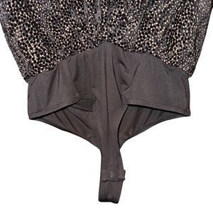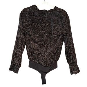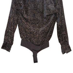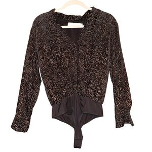 Chic burnout velvet bodysuit featuring a plunging neckline and long cuff sleeves. Wrap front accentuates your figure. Metallic dot print throughout.