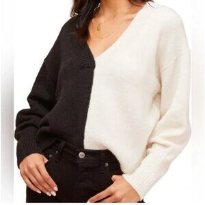Trendy black & white color cozy sweater by ASTR. This elegant pullover features a V-neckline, dropped shoulders and long sleeves. Color block pattern and ribbed trim.