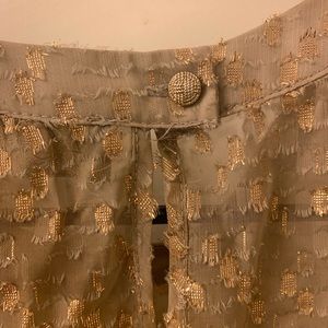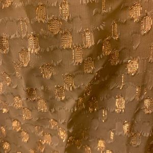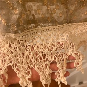 Cute top with metallic gold and texture detail. Crochet detailing at the bottom. Good worn condos; no stains, tears, pulling or obvious signs of wear.