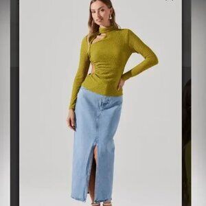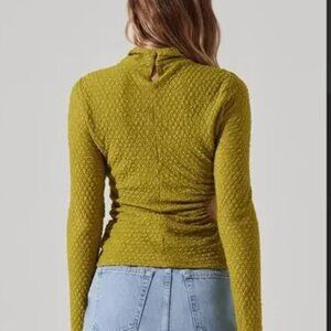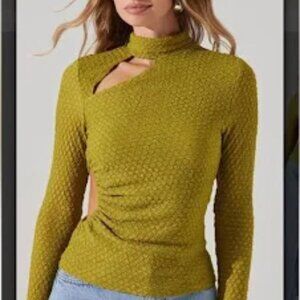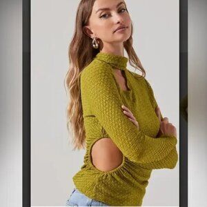 ASTR The LABEL Mock Neck Cut Out Top in Semi Sheer Textured Avocado Green Sz L