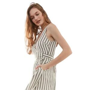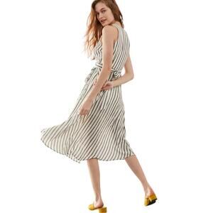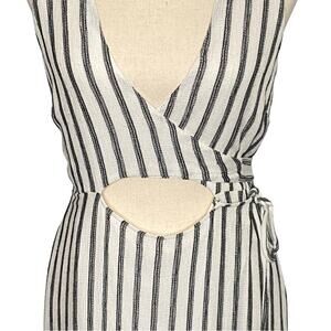 Sleeveless wrap midi dress from ASTR with a peek-a-boo cutout that’s perfect for any day + every way. Lightweight striped fabrication cut to a midi length in a slight fit + flare construction topped with a plunging v-neckline. Features a cut-out at the waist + a front slit at the skirt. Finished with a tie belt at the waist. Partially lined.
