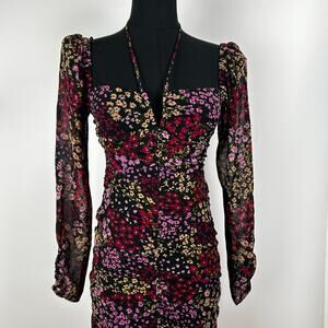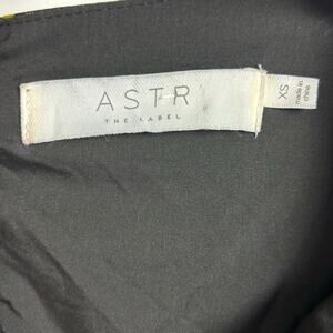 ASTR The Label Athena womens dress in black and floral. Halterneck tie closure with V-wire front. Ruched bodice. Flounced hem. Lightweight voile fabric. Hidden back zipper closure. Slight puff sleeve. MSRP at Revolve $158. Style No. ACDR101357. Size XS. Excellent used condition. No flaws detected. See measurements for proper fit.