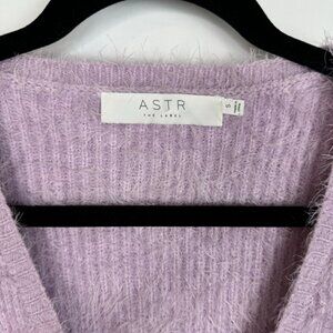 Keywords: fuzzy sweater, lilac sweater, ASTR The Label, wrap sweater, long sleeve top, V-neck sweater, polyester blend, acrylic sweater, cozy sweater, small size sweater, soft knit, winter fashion, women's sweater