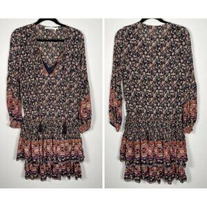 ASTR The Label Balloon Sleeve Printed Tiered Midi Chiffon Dress Brown Sz L #1523
