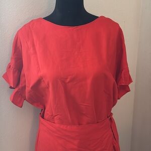 ASTR The Label Coral Red ruffle faux wrap around skirt ruffle sleeves dress Sz L