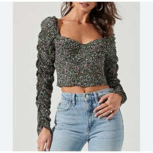 Features: Sweetheart neckline, long puff sleeves with ruched detailing, ditsy floral print, cropped length.
