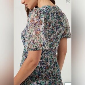 Chiffon like overlay fabric with adjustable ruching and sheer flowy hem and puff sleeve