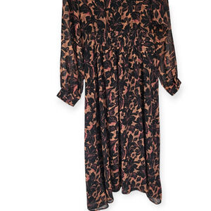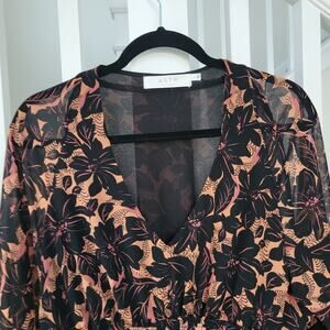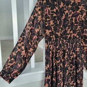 ASTR The Label Floral Smocked V-Neck Long Sleeve Dress Black/Coral Women Sz L