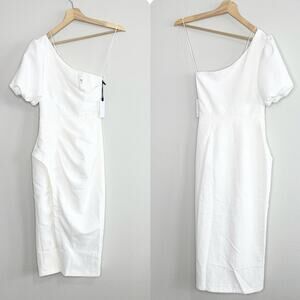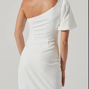This Astr The Label dress features a chic one-shoulder design with a puff sleeve, perfect for a wedding or cocktail event. The asymmetrical, ruffled slit adds a touch of elegance to its sheath silhouette, while the white or cream color options offer timeless sophistication.